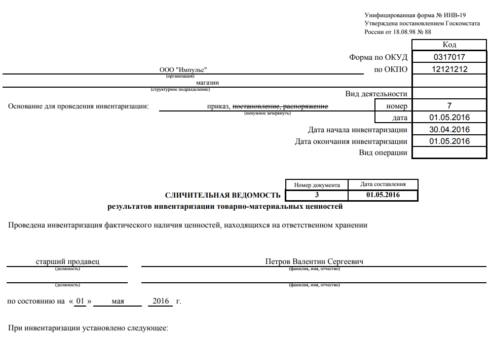 Образец заполнения сличительной ведомости по форме ИНВ-19