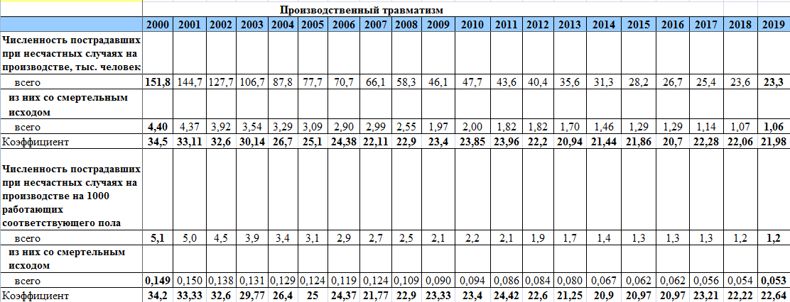 Если верить статистике, то с производственным травматизмом всё обстоит почти великолепно. К примеру, в 2019 г. несчастные случаи произошло с 23,3 тыс. человек, со смертельным исходом – 1,06 тыс. В 2018 г. – 23,6 тыс. человек и 1,07 соответственно. Если сравнить с 2000 годом, то показатели улучшились почти в пять раз! Но лично у меня даже поверхностный анализ таблицы вызвал вопросы, ответы на которые я не нашёл.