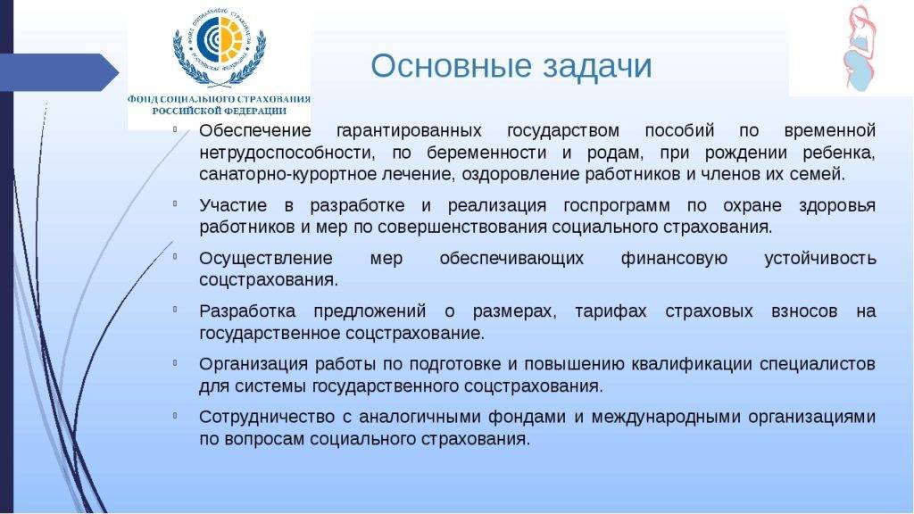 - Социальное обеспечение в связи с беременностью и материнством: оплата больничного листа, пособий при ранней постановке на учёт по беременности и при рождении, а также по уходу за ребёнком, финансирование родовых сертификатов;