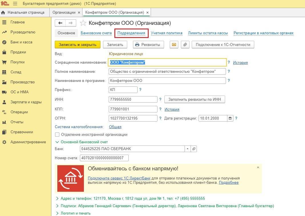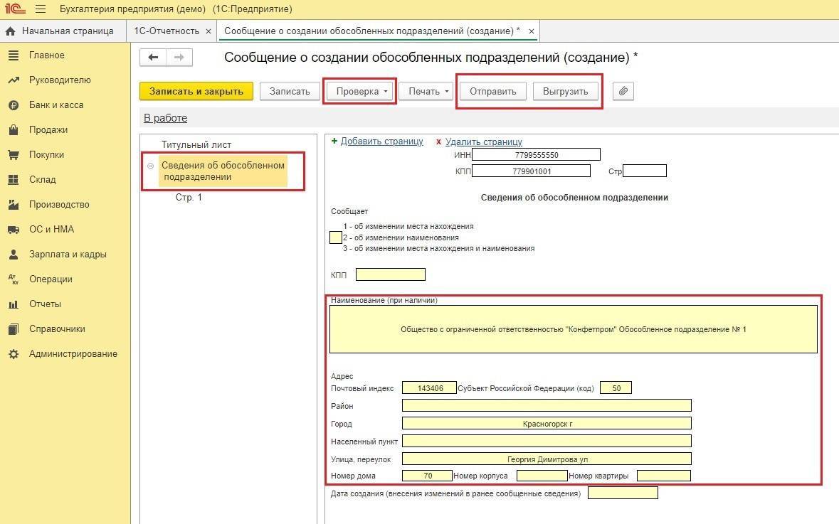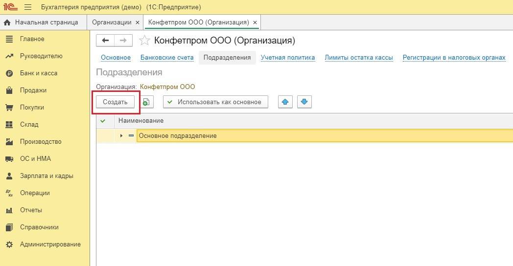 После в пункт “Создать” без ошибок заполнить все данные, которые принадлежат новому подразделению.