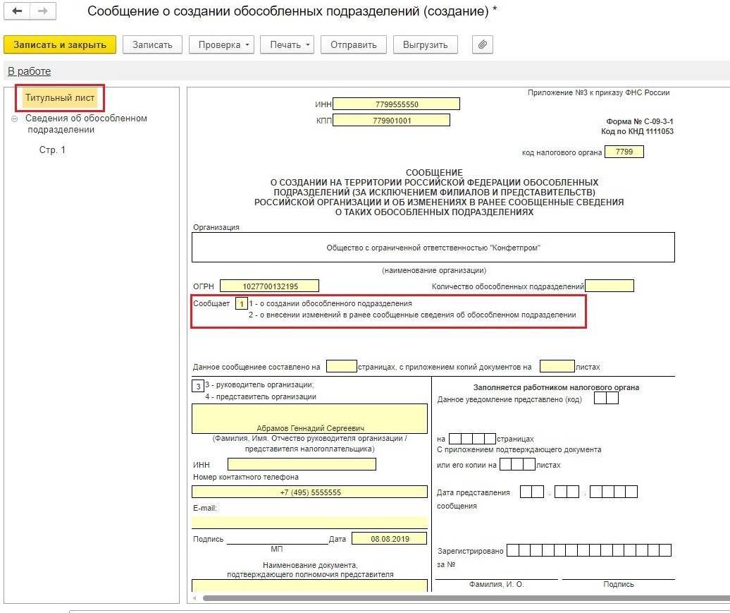 Надо внимательно проверить все данные организации (ИНН/КПП, ОГРН, название организации, код налоговой службы и т.д.) После проверки в графе “Сообщает” нужно выбрать значение, которое подходит для дальнейших действий, либо создать новое обособленное подразделение, либо внести изменение в уже существующее обособленное подразделение.