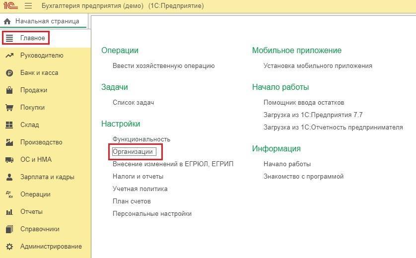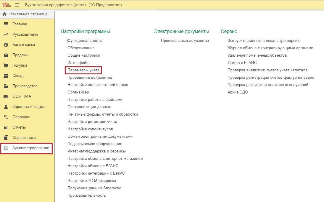 После присвоения подразделению КПП нужно отделить в программе подразделение, для этого выполняется ряд действий. “Администрирование” – “Параметры учета”.