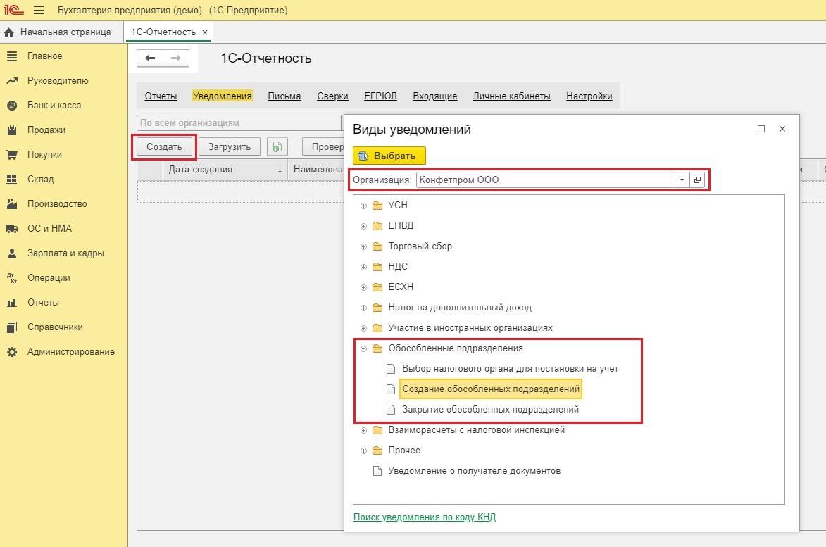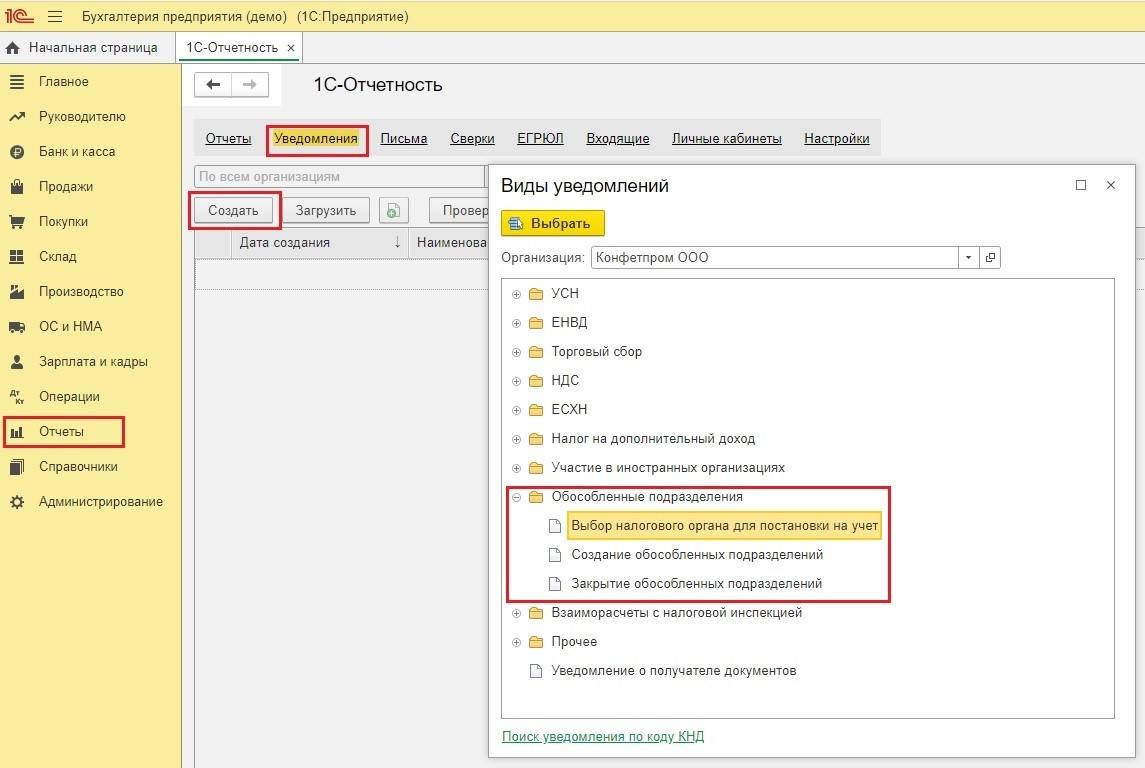 Для того чтобы в программе правильно это отобразить, необходимо зайти в раздел “Отчеты”, выбрать пункт “Уведомления, сообщения и заявления”, нажать “Создать”, далее “Виды уведомлений”, после “Обособленные подразделения” и “Выбор налогового органа”. Далее заполнить форму и готовое уведомление направить в налоговую инспекцию.