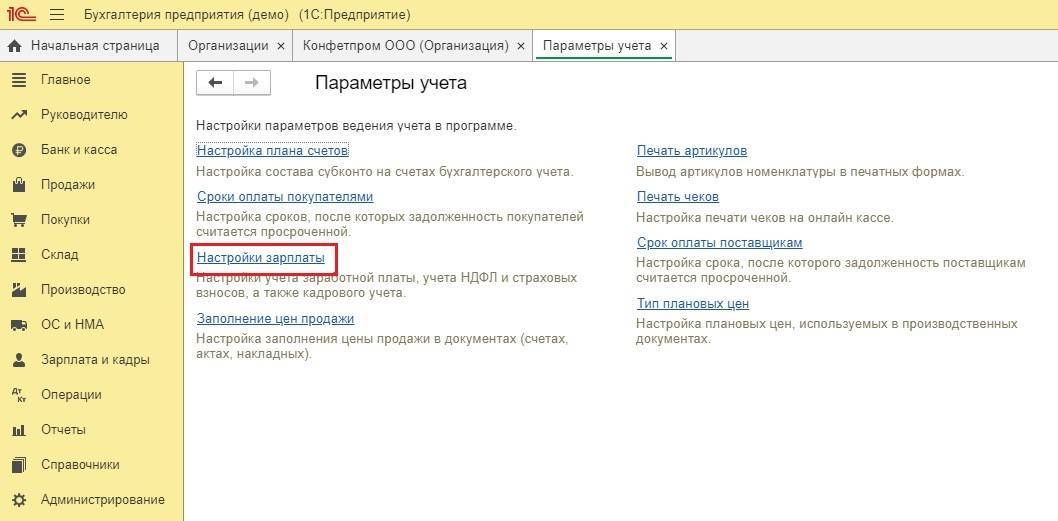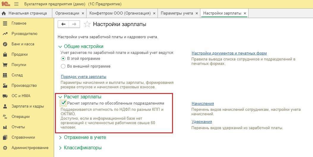 Для возможности ведения учета по обособленным подразделениям необходимо выполнить специальные настройки: раздел Администрирование — Параметры учета — Настройки зарплаты — Расчет зарплаты – флажок Расчет зарплаты по обособленным подразделениям.