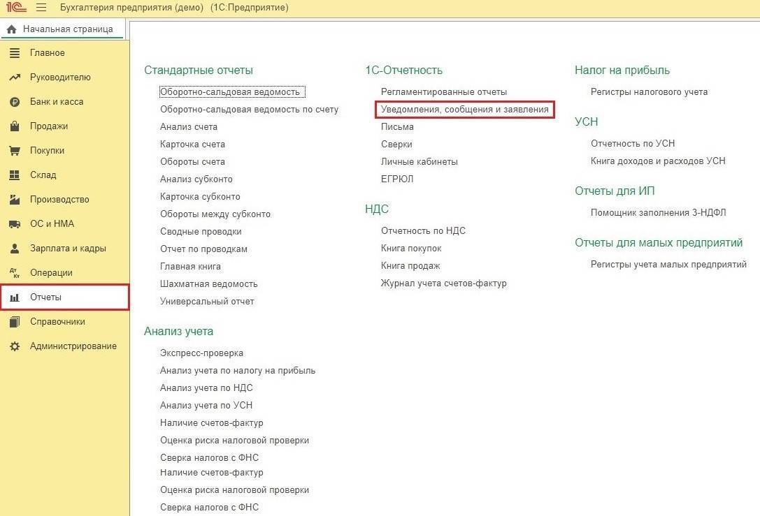 Подробно рассмотрим формирование уведомления в программе “1С:Бухгалтерия” в версии 3.0. Изначально необходимо зайти в раздел “Отчеты” и нажать на гиперссылку “Уведомления, сообщения и заявления”.