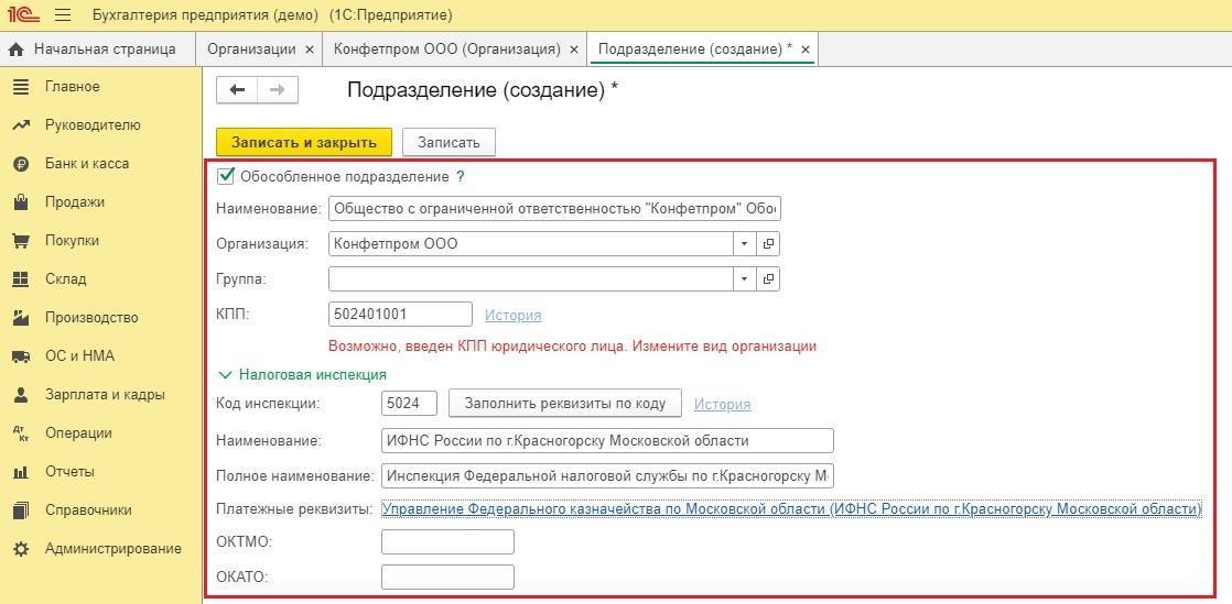 Установить галочку рядом с разделом “Обособленное подразделение” и без ошибок заполнить все данные, которые принадлежат новому подразделению. Для легкого заполнения указывается КПП и нажимается на пункт “Заполнить реквизиты по коду” далее программа сама заполняет всю информацию по подразделению, нужно будет только внести ОКТМО и ОКАТО.