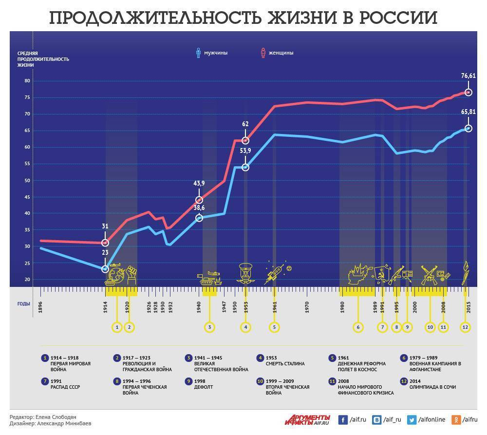 Так в Японии, Сингапуре и Франции среднестатистический гражданин живет около 80 лет. Сегодняшние показатели СПЖ в России действительно отстают от других развитых стран, хотя еще в 1960-х годах показатели были примерно одинаковыми.