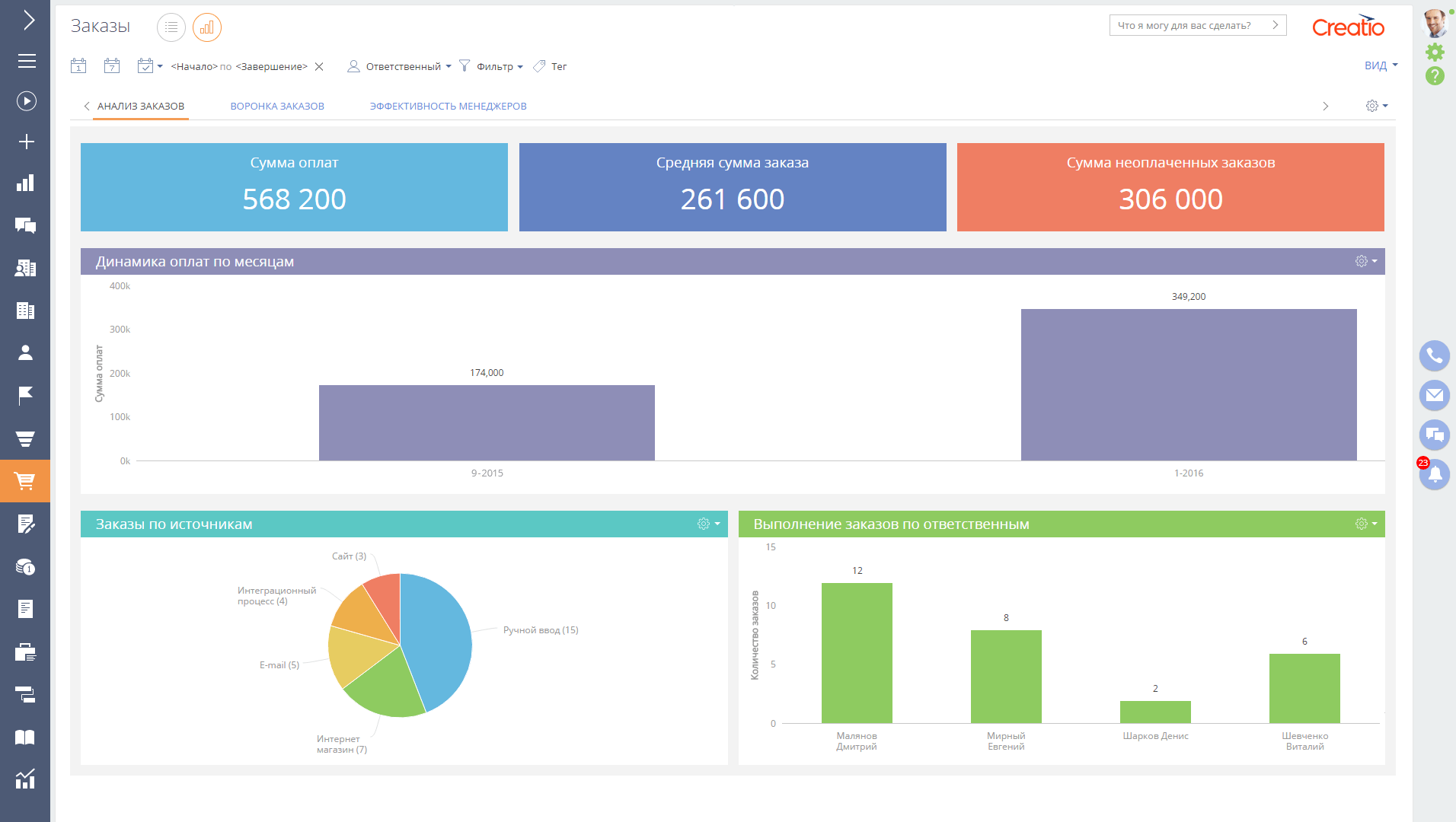 - Аналитические – формируют отчеты и аналитику. Например, разбивка заказчиков на категориям, эффективность сотрудников, маркетинговых мероприятий.