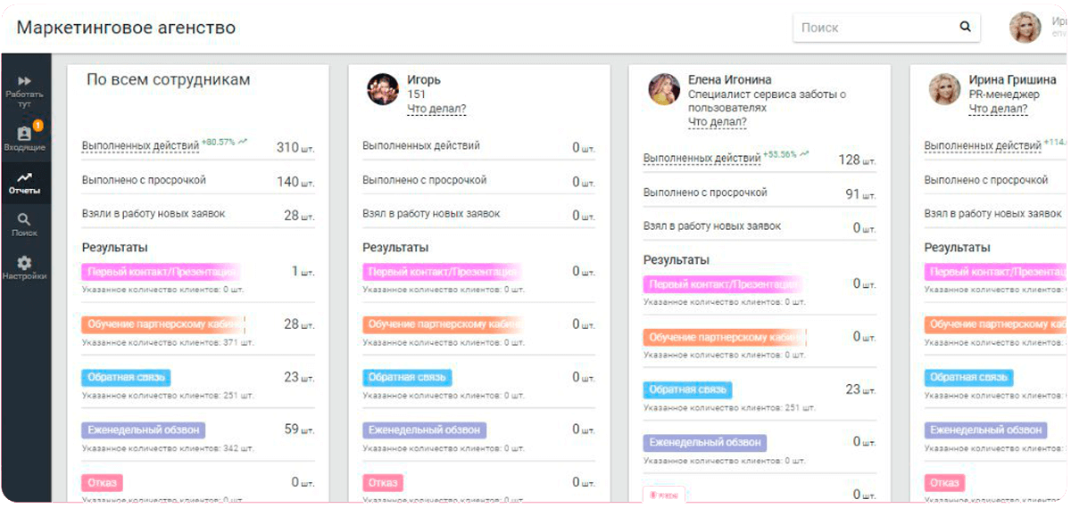 - Позволяет оценить эффективность работы отдела продаж и каждого менеджера в отдельности. CRM-программа собирает данные обо всех действиях сотрудников: количество звонков и встреч, временные затраты на заявку, выполненные и просроченные задания. Отчеты по KPI помогают быстро выявить неэффективных и слабых менеджеров.