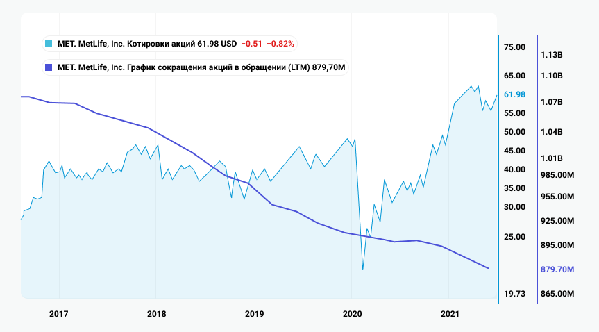 Кажущиеся на первый взгляд непримечательными дивиденды — это не единственный способ вознаграждения акционеров. За последние три года MetLife сократила количество акций в обращении более чем на 20%, что означает дополнительные 7,2% акционерной доходности в год.