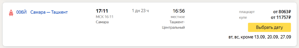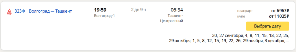 Поезд ходит в направлениях Ташкент-Самара и Ташкент-Волгоград, приобретать билеты необходимо не менее чем за 45 суток. Из Самары билет стоит от 8 063 рублей, из Волгограда — от 6 967 рублей.