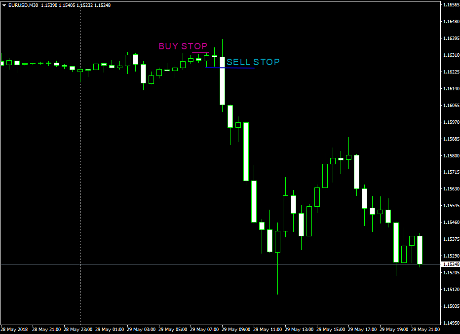 Дождавшись закрытия, приступаем к выставлению двух отложенных ордеров. Ордер на покупку, Buy Stop, размещается в точке максимума закрывшейся 30-минутной свечи. Ордер на продажу, Sell Stop, размещается в точке мининума.