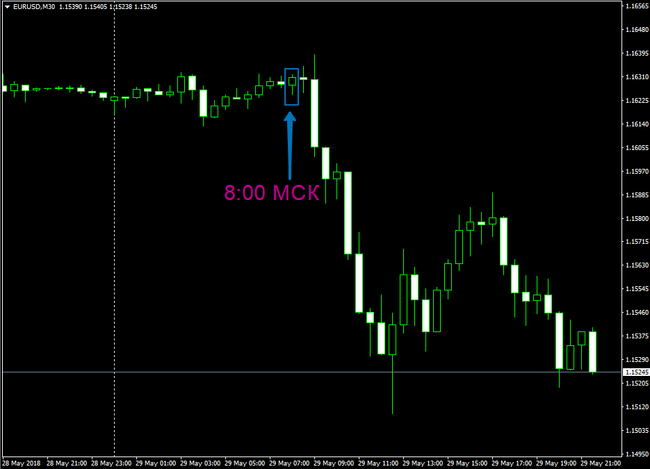 Рассмотрим, как реализуется эта простая стратегия Форекс без индикаторов. К восьми утра по Москве нужно быть у терминала, используя для торговли таймфрейм М30.
