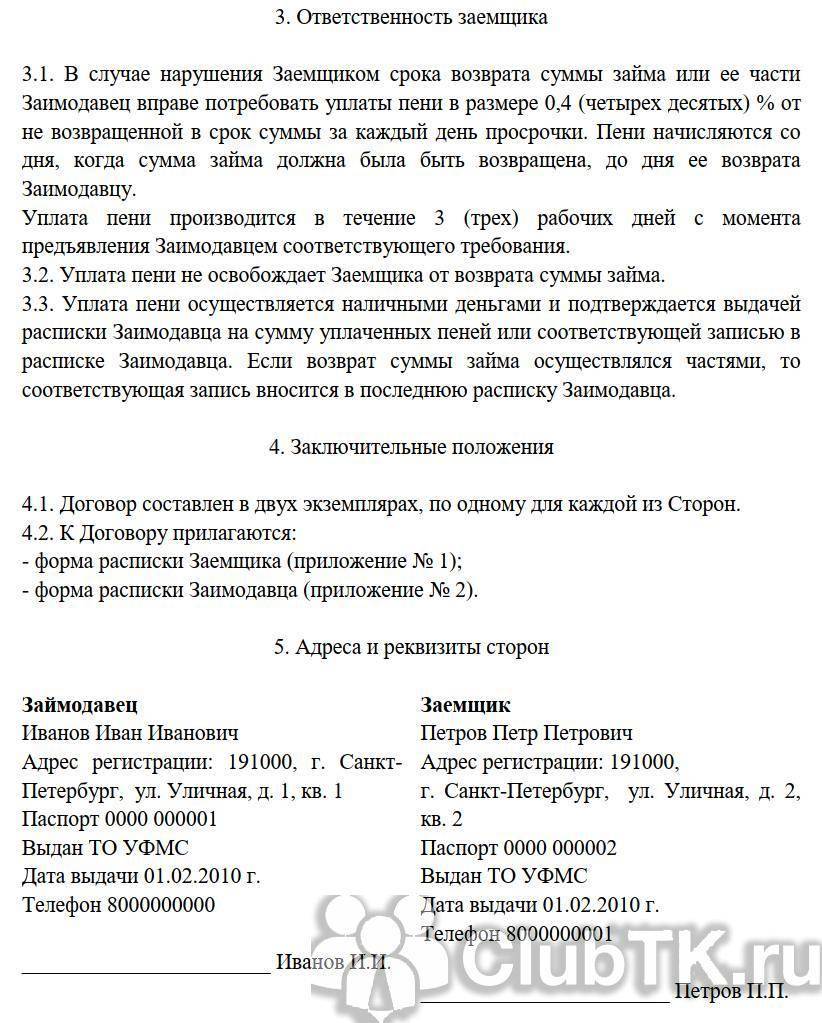 За нарушение условий договора займа предусмотрена гражданско-правовая ответственность. В первую очередь это ответственность за последствия просрочки возврата суммы займа. За нарушение установленных договором сроков возврата денежных средств можно предусмотреть ответственность в самом договоре в виде процентов от заемных средств или в установленной денежной сумме.