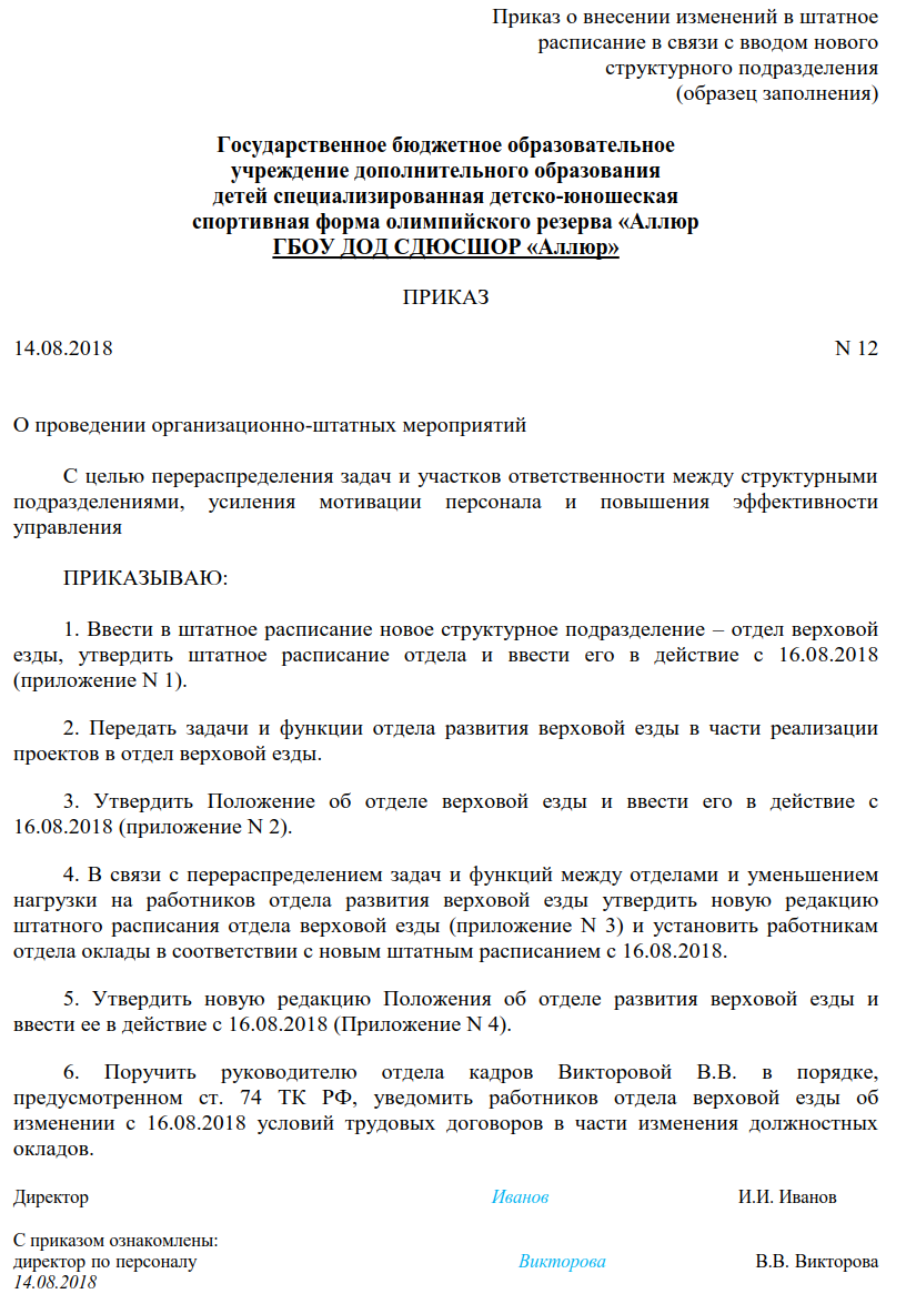 - Стороны знакомятся с распоряжением и утверждают его действие, расписываясь на документе.