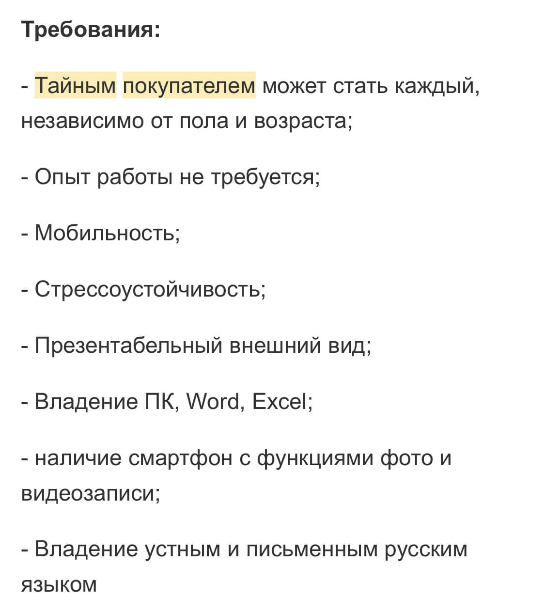 Чтобы стать тайным покупателем, особых навыков не требуется. К кандидату обычно предъявляют общие требования, свойственные любым другим профессиям