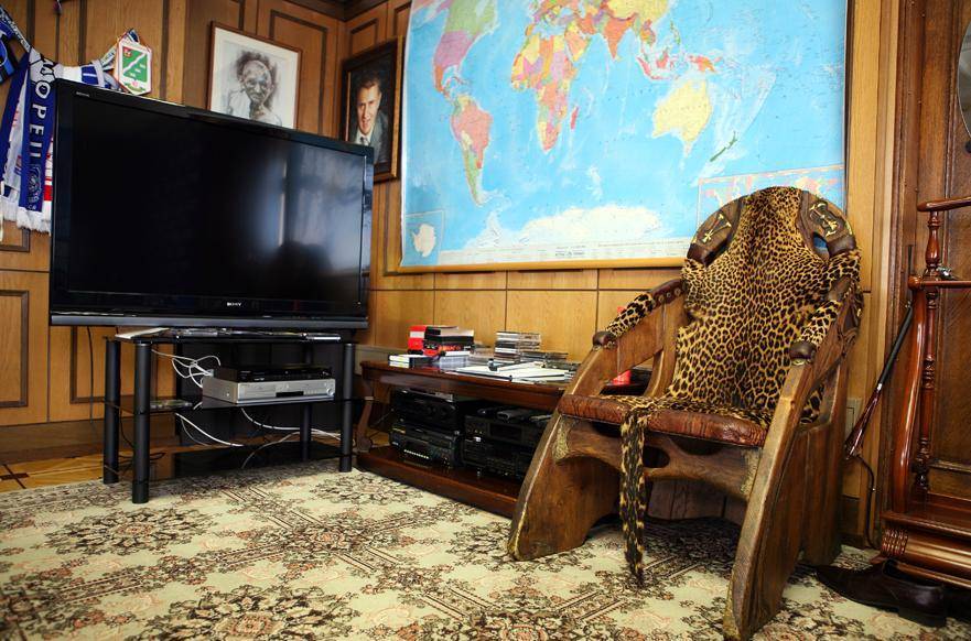 Есть и охотничьи трофеи, подаренные друзьями и избирателями. Речь идет, например, о чучелах хищников, волчьей и медвежьей шкурах. В центре гостиной – очень большой телевизор с функцией караоке. К гостиной примыкает зимний сад, в котором имеются не только живые, но и искусственные цветы.