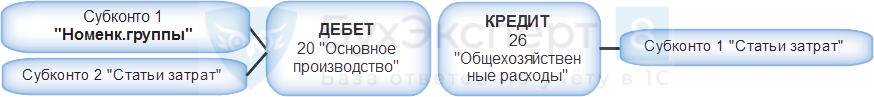 Общепроизводственные расходы распределяются в дебет счета 20 «Основное производство» по видам продукции, работ, услуг при процедуре Закрытие месяца.