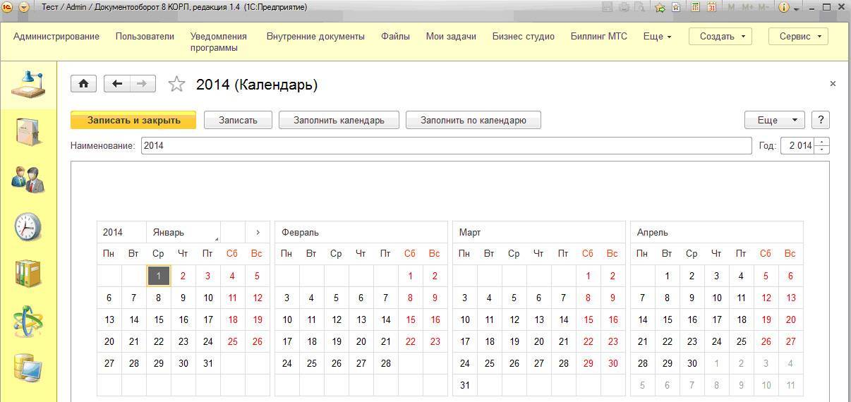 Шаг 1. Определение, сколько валового времени имеется у компании. Для этого необходимо в ДО заполнить производственный календарь, указав в нём рабочие и выходные дни (рис.1).