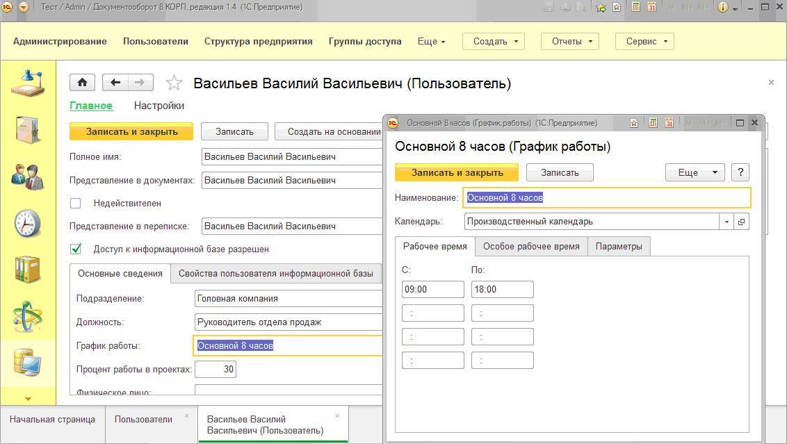 Шаг 2. Ввод в базу «1С:Документооборот» перечня сотрудников, чьим рабочим временем планируется управлять, и назначение графиков работы (рис. 2). Это стандартный функционал системы, необходимо только корректно заполнить справочники. Для этого можно использовать, например, данные из информационной системы «1С:Зарплата и управление персоналом» , если в ней ведётся расчет заработной платы.