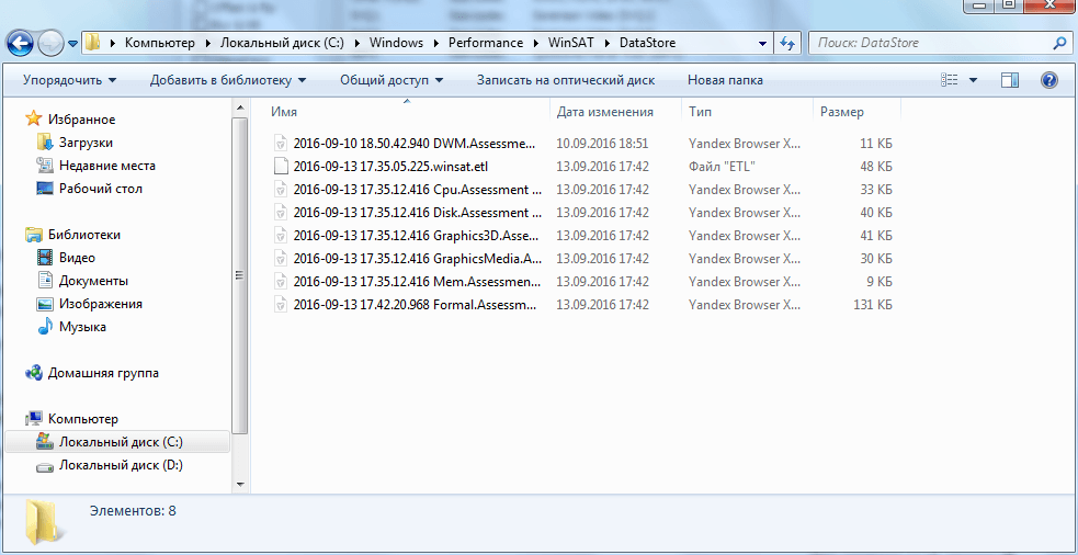 Если эти способы вам не помогли, то, возможно, придётся прибегать к обновлению интегрированной среды БИОС, драйверов, в частности, DirectX или откатываться к предыдущим версиям. Войдите в систему с правами администратора и пройдите по пути C:\Windows\Performance\WinSAT\DataStore.