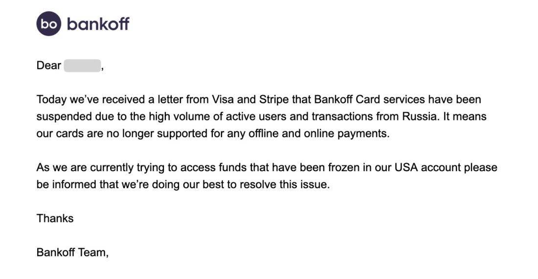 Bankoff сегодня разослал клиентам уведомление о том, что Visa и Stripe заблокировали счета и прекратили обслуживание сервиса из-за высокого объема пользователей и транзакций из России. Виртуальные карты Bankoff более невозможно использовать для каких бы то ни было онлайн и офлайн платежей.