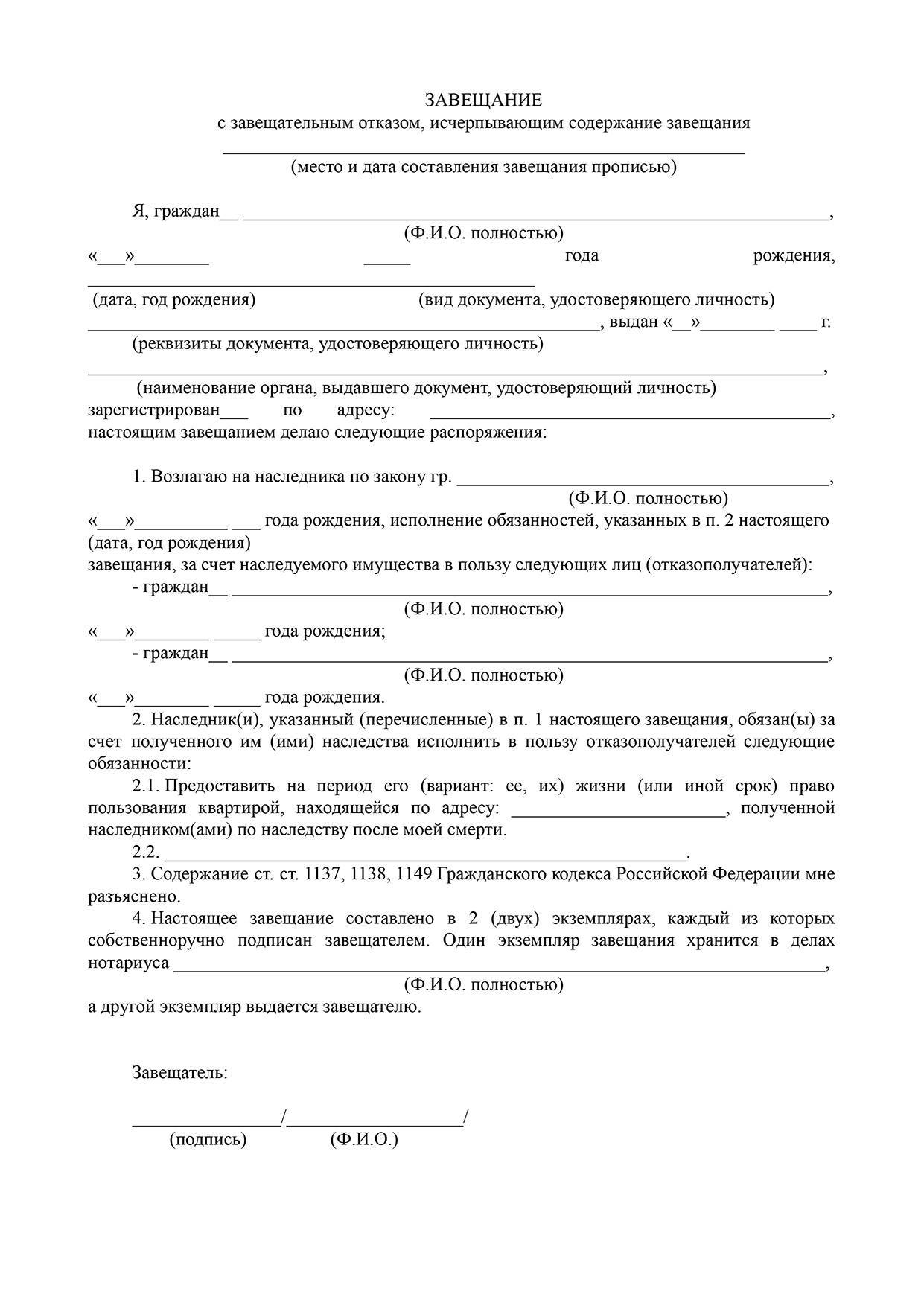 Образец завещания с завещательным отказом
