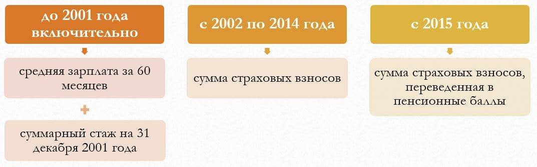 - с 2015 года в расчет идут тоже взносы, но они сразу пересчитываются в пенсионные баллы. А все заработанное до 2014 года включительно пересчитывается в баллы по специальной формуле.