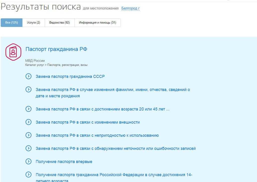 В строке поиска наберите «замена паспорта» и жмите на значок поиска.