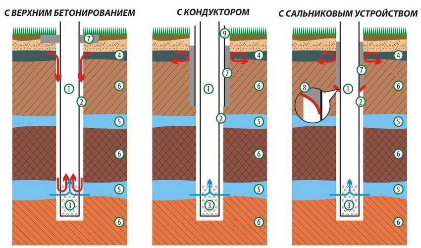 Варианты исполнения скважины. 1-эксплуатационная колонна, 2- затрубное пространство, 3 — фильтровая часть колонны, 4 — «верховодка», 5 — водоносные пласты, 6 — водоупорные пласты (плотные глины), 7 — цементная заливка, 8 — сальниковое устройство, 9 — глухая стальная колонна (кондуктор)