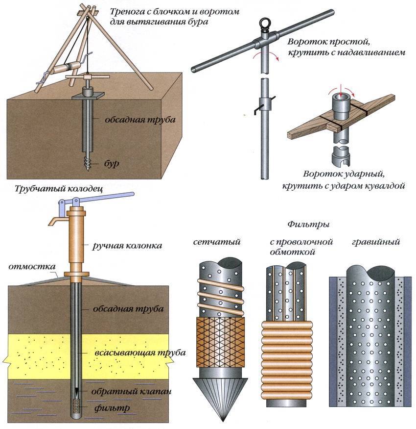 Скважины могут быть самых разных конструкций, но для самостоятельного выполнения больше всего подходят: