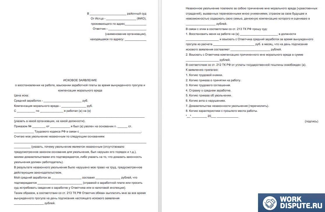 - Проинформировать работодателя о необходимости произвести положенные выплаты – средний заработок за период вынужденного прогула, компенсацию за моральный вред.
