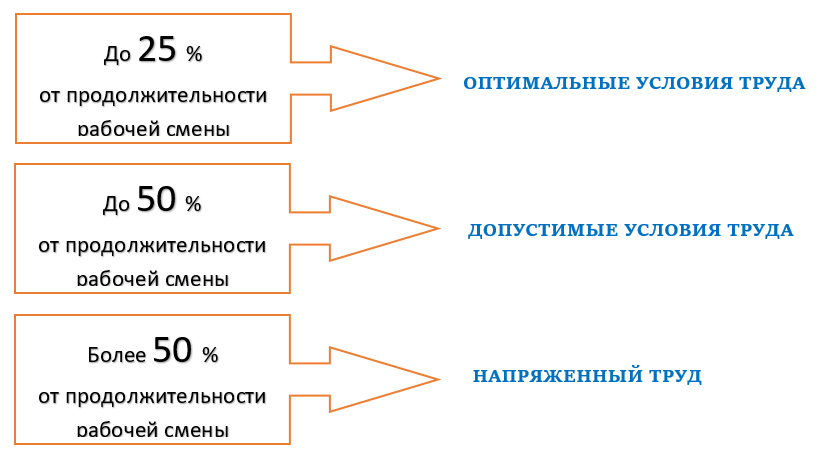 В процессе производственной деятельности человек выполняет задания различной степени сложности. Обработка какой-либо информации или выполнения задания без оценки его результатов является менее сложным трудом, что позволяет оценить его как оптимальный. Если же к указанным действиям добавляется необходимость проверки полученного результата, то такие условия труда являются допустимыми.