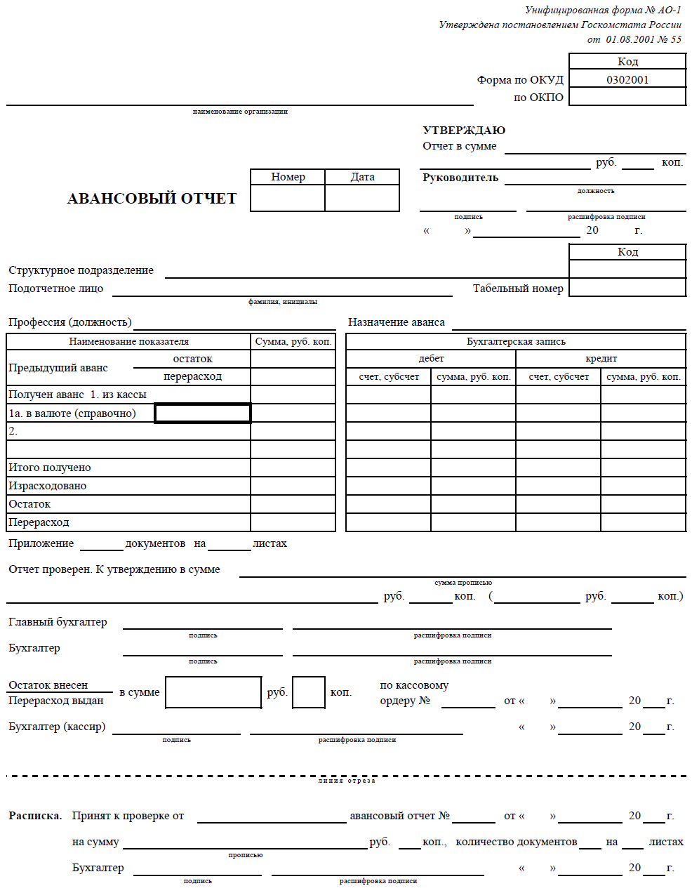 Авансовый отчет оформляется по форме АО-1 и сдается главному бухгалтеру или бухгалтеру (при их отсутствии — руководителю). К АО-1 прилагаются оправдательные документы. Авансовый отчет утверждается руководителем.