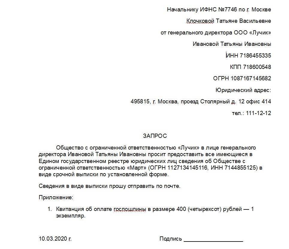 данные юрлица, в отношении которого подаёте запрос — ИНН, ОГРН, наименование;