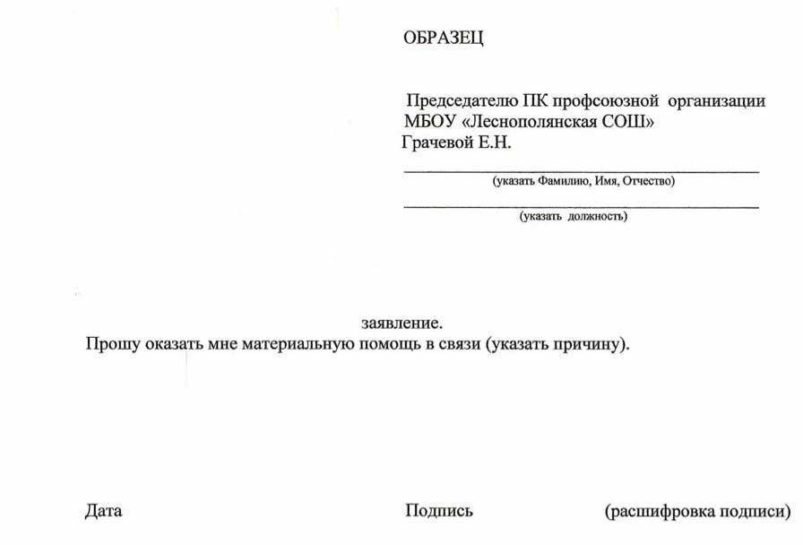 Список ситуаций, по которым предоставляются денежные выплаты, в обязательном порядке прописан в уставе любой профсоюзной организации. Заявление в профсоюз на мат. помощь составляется в свободной письменной форме. Просьба оформляется на имя председателя профсоюзного объединения.