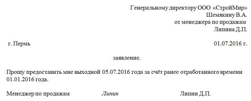 Чтобы получить лишний свободный день, желательно подать документ за несколько дней до указанной даты. Отгул гарантировано предоставляется за переработанное время, если для этого существует веская причина, или же вы относитесь к одной из ранее перечисленных категорий граждан.